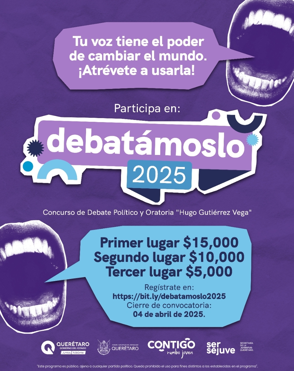 La convocatoria cierra el próximo 4 de abril, las bases e información relacionada al concurso puede consultarse en la página de la Secretaría: sejuve.queretaro.gob.mx; asimismo, las y los interesados en participar pueden realizar su registro en el siguiente enlace: https://bit.ly/debatamoslo2025.