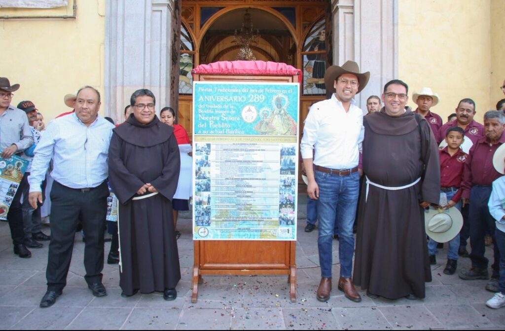 El presidente municipal de Corregidora, Chepe Guerrero, acompañó a las autoridades religiosas y representantes de las corporaciones en la develación del programa y pega de bando de las Tradicionales Fiestas Patronales por el 289° aniversario de la Basílica de Nuestra Señora de El Pueblito por las principales calles de la zona.