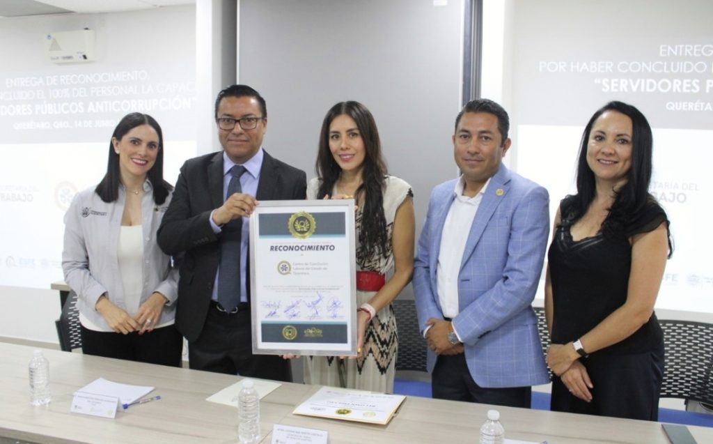 La secretaria del Trabajo en el Estado, Liliana San Martín Castillo, atestiguó la entrega de reconocimiento al Centro de Conciliación Laboral de Querétaro, por haber acreditado al cien por ciento del personal con la capacitación «Servidores Públicos Anticorrupción», lo cual ayuda en brindar un servicio público eficaz y transparente.