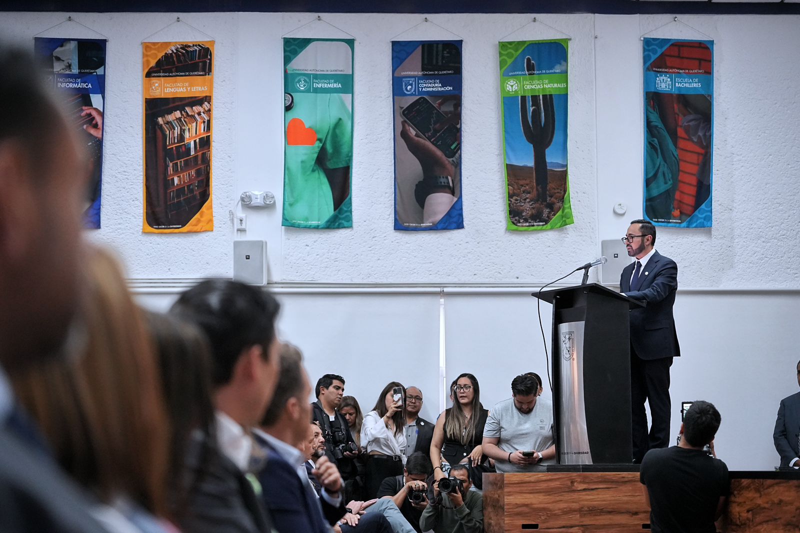 • El presidente municipal de Querétaro, Felifer Macías, acompañó al gobernador del estado Mauricio Kuri González y a la Rectora de la Universidad Autónoma de Querétaro (UAQ), Silvia Lorena Amaya Llano, a la toma de protesta del nuevo Consejo Directivo del Patronato de la UAQ 2025-2028.