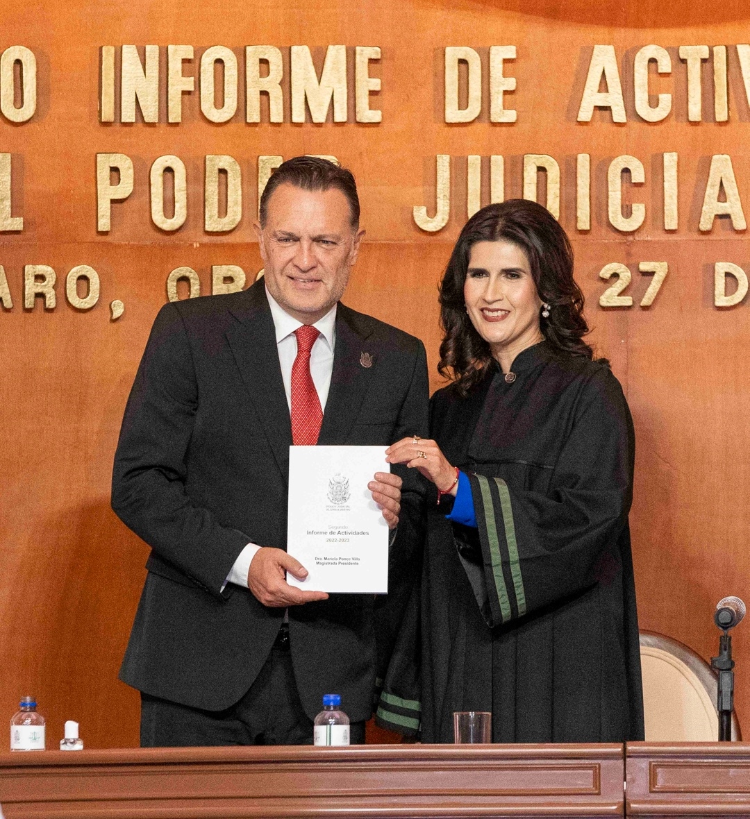 El gobernador, Mauricio Kuri González, acudió a la presentación del Segundo Informe de Actividades 2022-2023 de la magistrada presidenta del Poder Judicial del Estado, Mariela Ponce Villa, quien destacó las acciones para la modernización de los procesos, así como el fortalecimiento en la infraestructura y la capacitación al personal, a fin de ratificar la confianza de los ciudadanos en dicha institución.