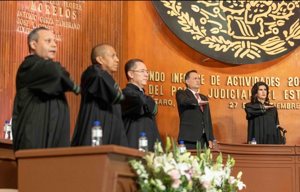 Dentro de la sesión solemne de Pleno del Tribunal Superior de Justicia, celebrada en el Teatro de la República, la Magistrada Presidenta destacó que, por quinto año consecutivo, la organización México Evalúa reconoció a Querétaro con el primer lugar nacional en Justicia Oral Penal, gracias a la coordinación del Sistema Cosmos, y el primer lugar que le otorgó World Justice Project en Índice de Estado Derecho en México.