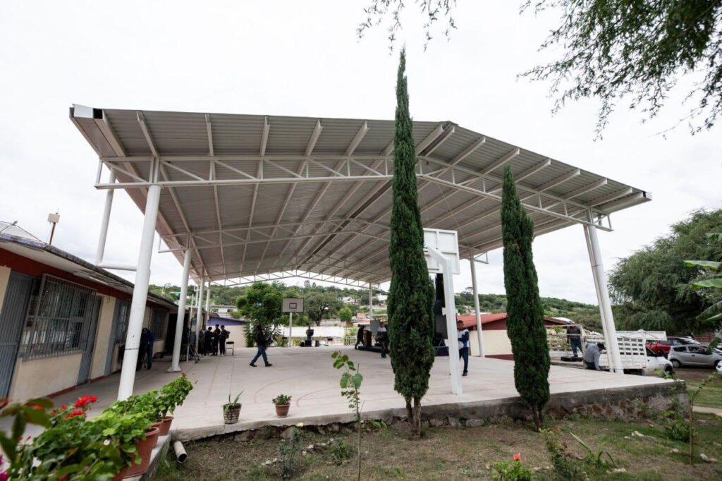 Agregó que, en el caso particular de la techumbre de la telesecundaria Lázaro Cárdenas, los trabajos consistieron en cimentación, suministro y colocación de columnas de acero, fabricación y colocación de armadura metálica y lámina, así como la fabricación de tableros de basquetbol y la construcción del piso de la cancha. Agregó que la obra abarca un área de 370 metros cuadrados y beneficia a 544 habitantes.