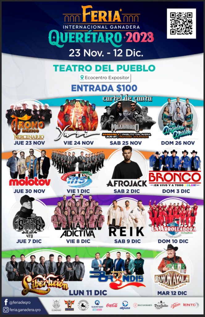 Y recuerda que con tu boleto de entrada a la Feria de 100 pesos, disfrutarás gratis del Teatro del Pueblo, Circo Roncally, Patinaje sobre Hielo, Rodeo Americano, Barrileras, Casa del Terror, Villa Navideña de Coca Cola, Exposiciones y degustaciones ganaderas, y más de 50 juegos mecánicos gratis del 27 al 29 de noviembre, y del 4 al 6 de diciembre.