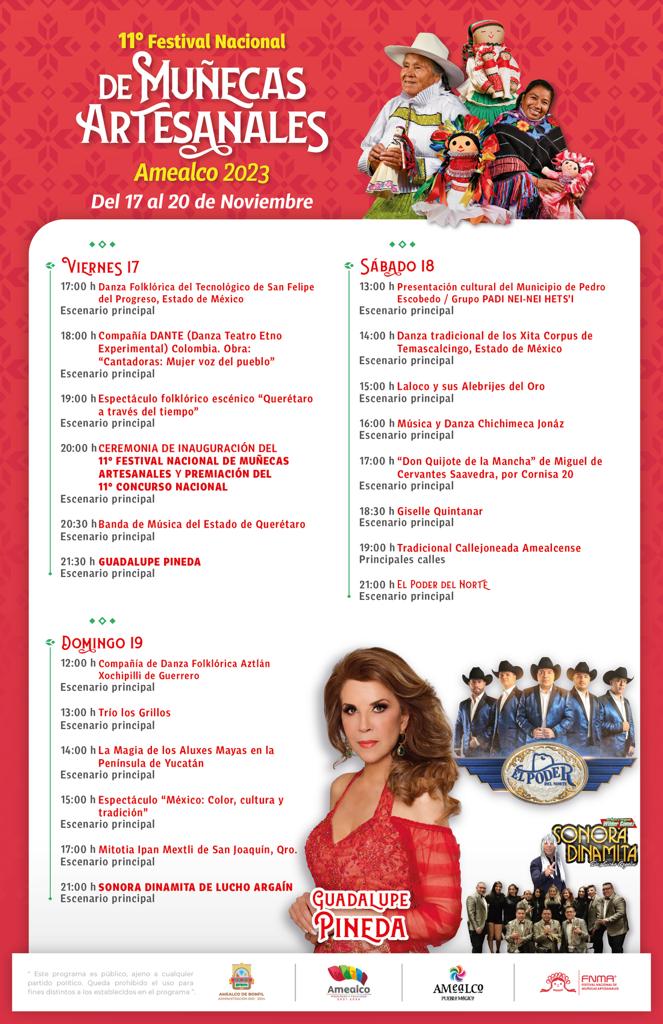 Este festival se llevará a cabo del 17 al 20 de noviembre en el jardín principal de Amealco y promete ser una experiencia única y enriquecedora para todos los asistentes, pues contará con diversas actividades culturales, el concurso nacional de muñecas artesanales, así como las presentaciones artísticas de “Guadalupe Pineda”, “El poder del norte” y “La Sonora Dinamita”.