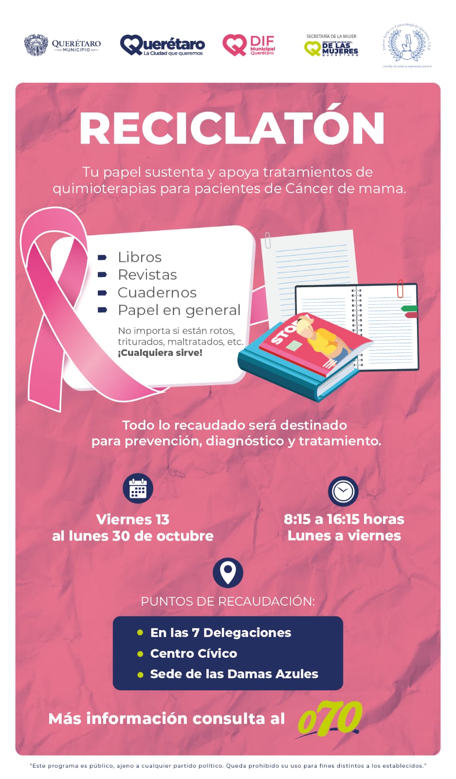 Por otra parte, en compañía de la Presidenta de Damas Azules I.A.P., Norma Leticia Ruiz Luna, Arahí Domínguez señaló que mediante un esfuerzo interinstitucional, el Municipio de Querétaro colocará 8 puntos de acopio -uno por cada delegación y en el Centro Cívico de Querétaro- para sumarse a la campaña “Reciclatón: el papel de tu vida”, que consiste en el compendio de papel reciclable: cuadernos, libros o revistas, para recaudar recursos y otorgar tratamientos, cuidados paliativos o acompañamiento a las mujeres diagnosticadas con cáncer.