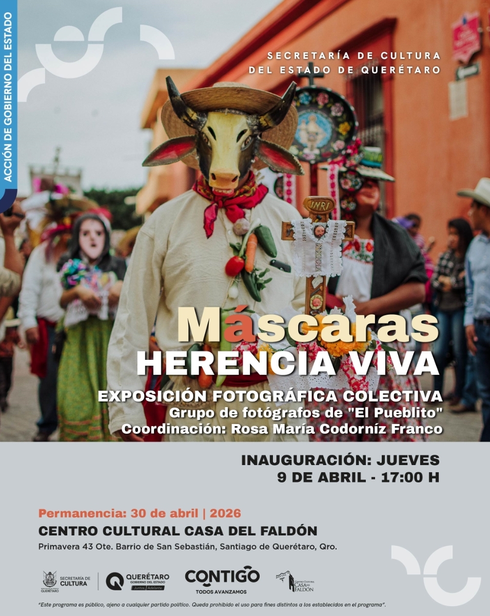 Del 9 al 30 de abril el Centro Cultural Casa del Faldón, de la Secretaría de Cultura del estado, albergará la exposición “Máscaras: Herencia Viva”, una muestra fotográfica que centra su mirada en uno de los símbolos esenciales de las festividades en honor a Nuestra Señora de El Pueblito, en esa comunidad durante el mes de febrero, en el municipio de Corregidora.