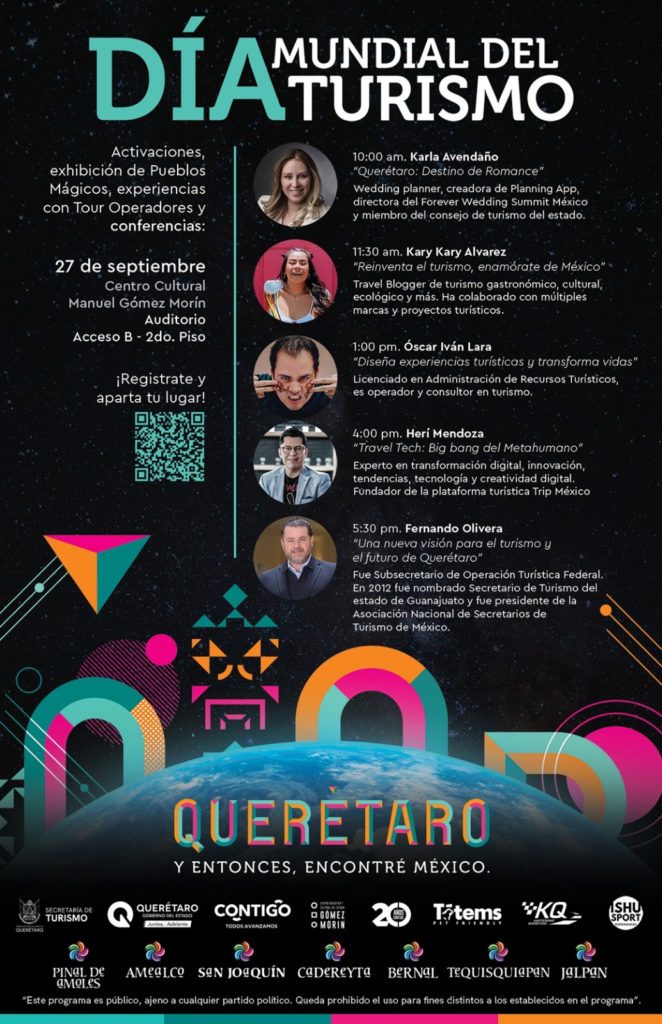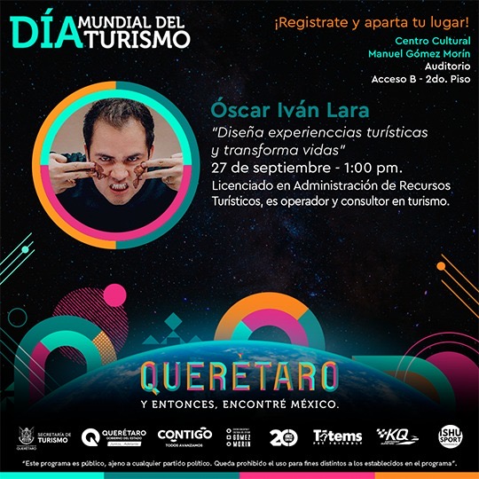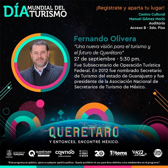 A las 17:30 horas, Fernando Olivera Rocha, ex subsecretario de Turismo Federal y ex secretario de Turismo de Guanajuato y Tamaulipas, ofrecerá la conferencia “Una nueva visión para el turismo y el futuro de Querétaro”. A las 13:00 horas, Óscar Iván Lara, operador y consultor turístico, ofrecerá la ponencia “Diseña experiencias turísticas y transforma vidas”.