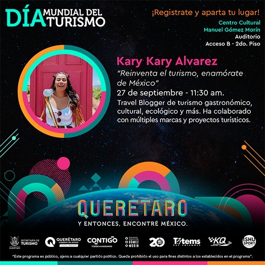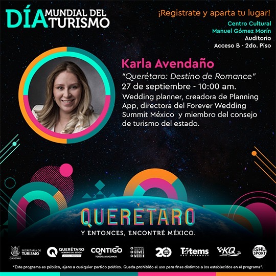 También se impartirá la conferencia, “Reinventa el turismo, enamórate de México”, a cargo de Kary Kary Álvarez, Blogger de viajes que ha colaborado con múltiples marcas y proyectos turísticos. A las 10:00 horas, la Weeding Planner, Karla Avendaño, ofrecerá la conferencia “Querétaro, destino de romance”.