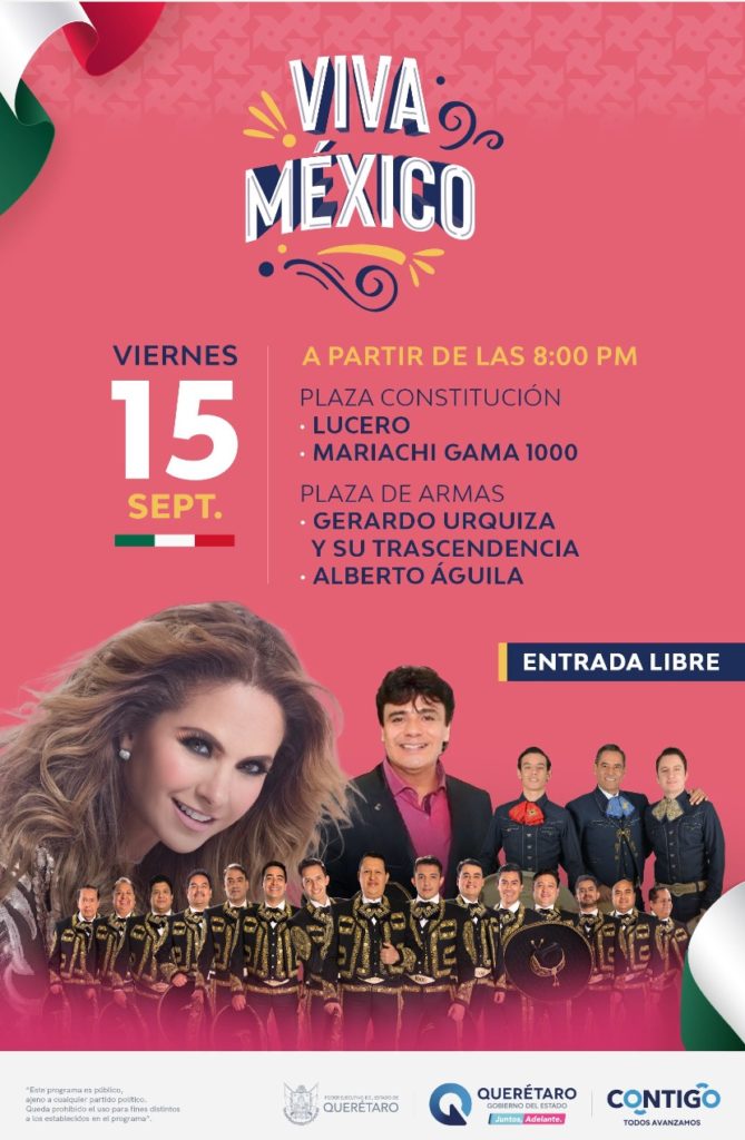El Poder Ejecutivo del Estado de Querétaro invita a las y los queretanos a disfrutar las festividades patrias del 15 de septiembre en familia, en orden y armonía, durante tres eventos con los que se celebrará el 213 aniversario del Grito de Independencia en México.