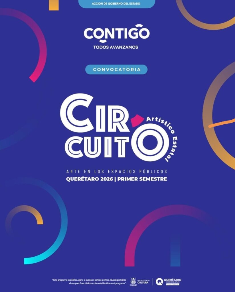 La Secretaría de Cultura del estado (Secult) lanzó la convocatoria “Circuito Artístico Estatal: arte en los espacios públicos, Querétaro 2026, primer semestre”, dirigida a artistas, colectivos y agrupaciones artísticas interesados en acercar las diversas expresiones artísticas y culturales a la población queretana a través de presentaciones y actividades en plazas, parques y espacios públicos de los 18 municipios de la entidad.