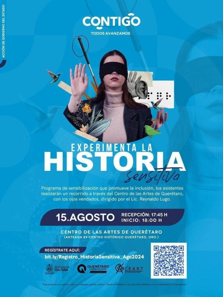 Para asistir al programa de sensibilización, los interesados deben registrarse de manera gratuita en https://bit.ly/Registro_HistoriaSensitiva_Ago2024 . Hasta ahora se han llevado a cabo 72 recorridos con la asistencia de casi mil 500 personas, en sedes como el CEART, el Museo de Arte de Querétaro, Galería Libertad, Palacio de Gobierno, el Ex Convento de la Santa Cruz y Plaza Antea.