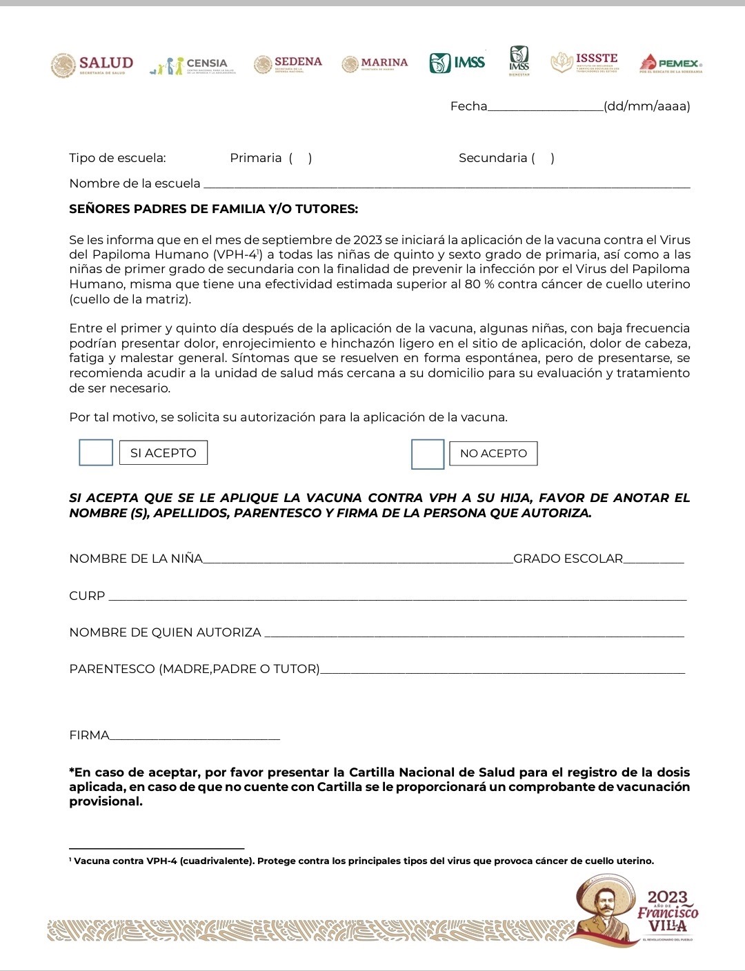 Se invita a la población a estar pendiente de las actividades que se realizarán en las escuelas, o bien, acudir a su unidad de salud médica más cercana con el formato de consentimiento informado firmado por la madre, padre o tutor el cual debe incluir el CURP de la adolescente.