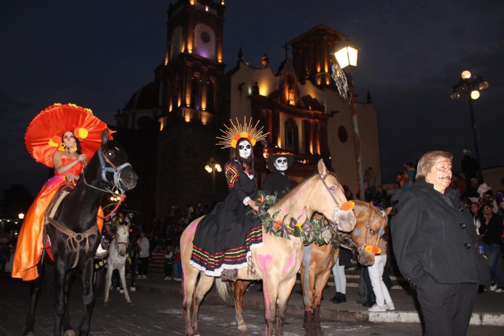Desfile “Manantial de Ánima”, con catrines y catrinas a caballo deslumbrando con su elegancia.