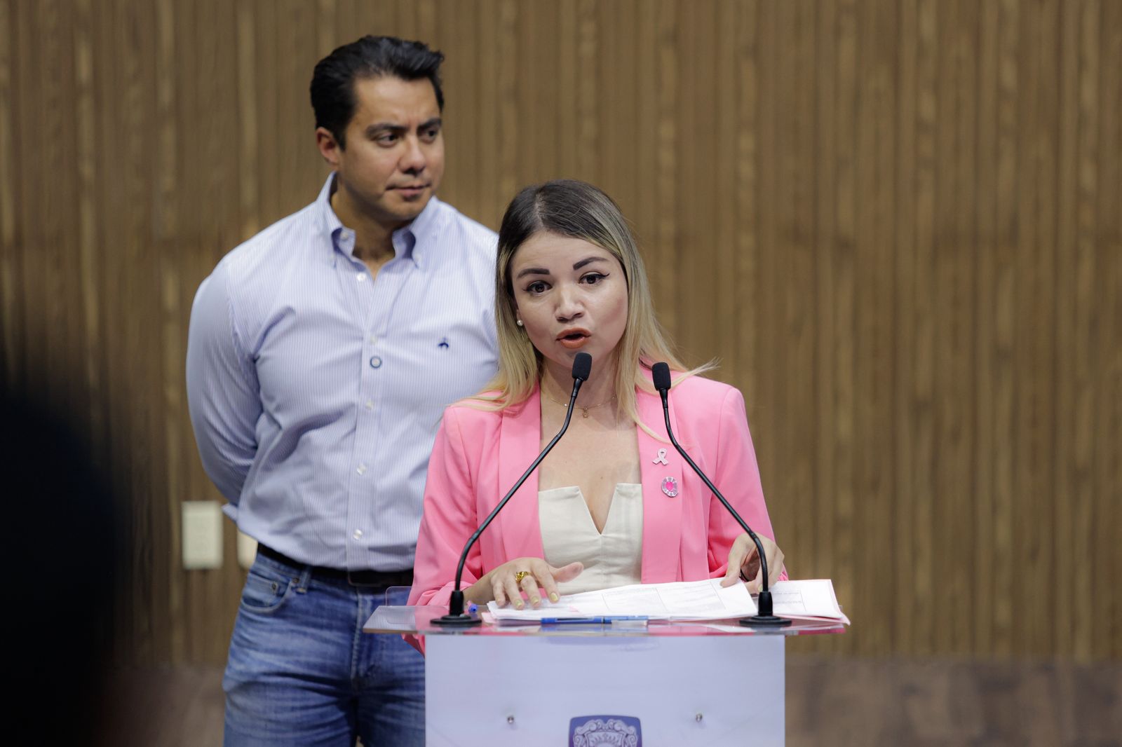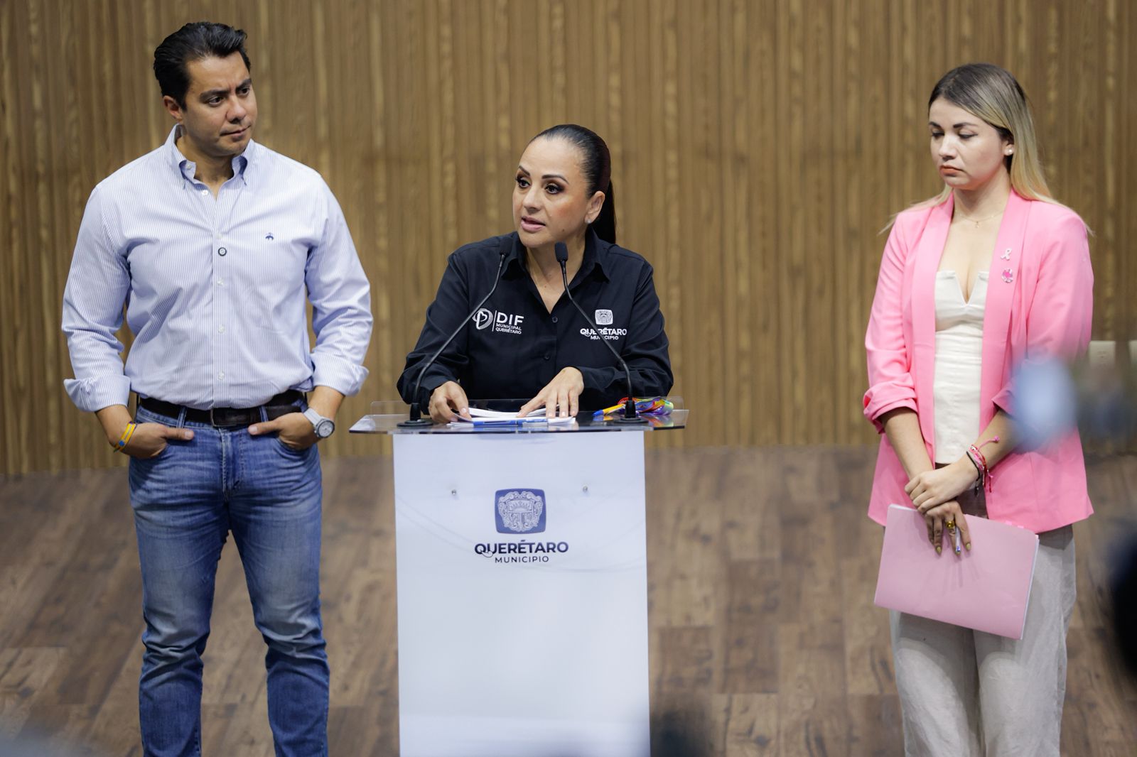 Textual: “Nos sumamos en el municipio de Querétaro a todos los esfuerzos de la sociedad civil organizada, gobierno del estado y múltiples dependencias, para juntos luchar contra el cáncer, para juntos prevenir el cáncer. Hemos aplicado más de novecientos escaneos mamarios, entre muchas otras estrategias de prevención de cáncer de mama, y hemos intensificado todas las conferencias, ponencias y campañas de prevención y concientización desde la Secretaría de la Mujer para prevenir este tema, y también dar acompañamiento para las mujeres que padecen esta enfermedad, donde siempre en equipo, juntos, vamos a luchar para superar el cáncer de mama”.