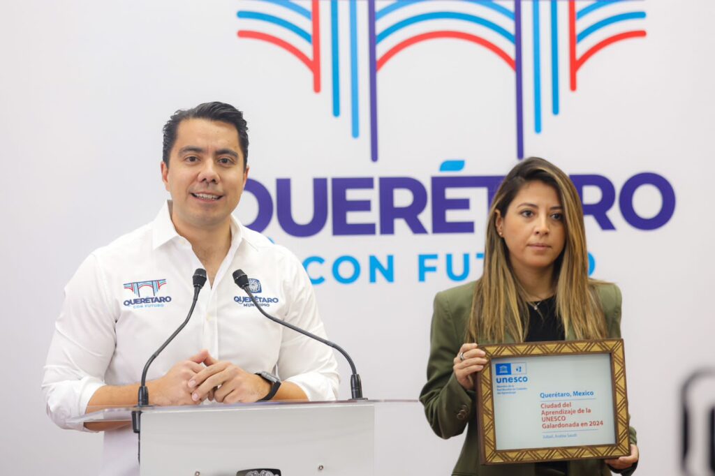 El presidente municipal, Felifer Macías, anunció que Querétaro fue reconocido con el premio UNESCO Ciudad del Aprendizaje 2024, entregado durante la Sexta Conferencia Internacional sobre Ciudades del Aprendizaje en Arabia Saudita, donde resalta el compromiso del municipio con la promoción de un aprendizaje inclusivo y la creación de oportunidades educativas para todas y todos los queretanos.