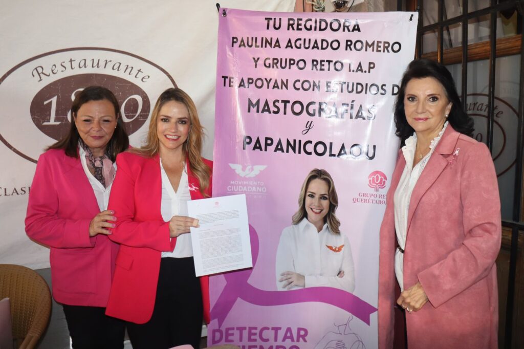 En el marco del Mes de la Concientización Sobre el Cáncer de Mama, la regidora del municipio de Querétaro, Paulina Aguado Romero en colaboración con Grupo Reto Querétaro IAP, su presidenta C. Luz María Amieva Maza, llevaron a cabo la firma de convenio en donde presentaron el apoyo gratuito de estudios de papanicolaou y mastografías a mujeres de Querétaro con el objetivo de facilitar el acceso a servicios de salud especializada para la detección de cáncer de mama.