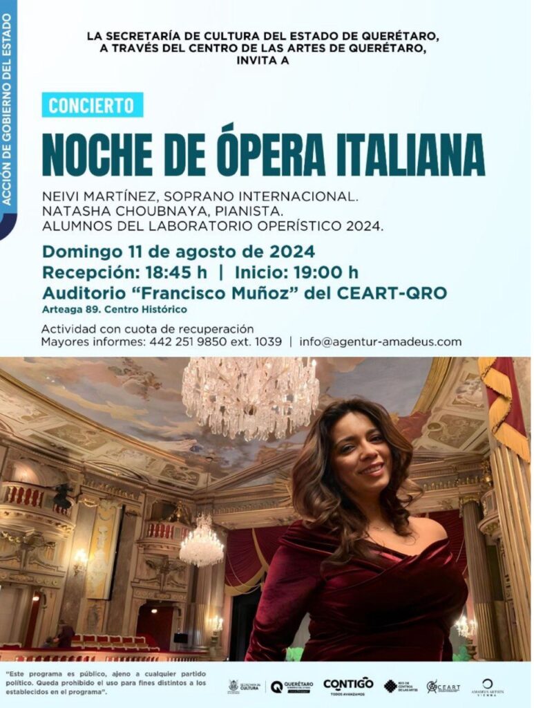 El auditorio “Francisco Muñoz” del Centro de las Artes de Querétaro será la sede de la “Noche de ópera italiana” que la soprano internacional Neivi Martínez ofrecerá el próximo domingo 11 de agosto, a manera de colofón del Laboratorio Operístico 2024 que la propia artista de origen germano-mexicano imparte en la capital queretana a cantantes profesionales y aficionados.