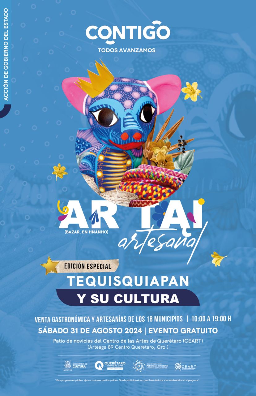 Este sábado 31 de agosto, en el Centro de las Artes de Querétaro (CEART), se llevará a cabo la edición número 14 del Bazar Artesanal Ar Tai, con la participación de 130 artesanas y artesanos de los 18 municipios del estado, en esta ocasión dedicado a Tequisquiapan.