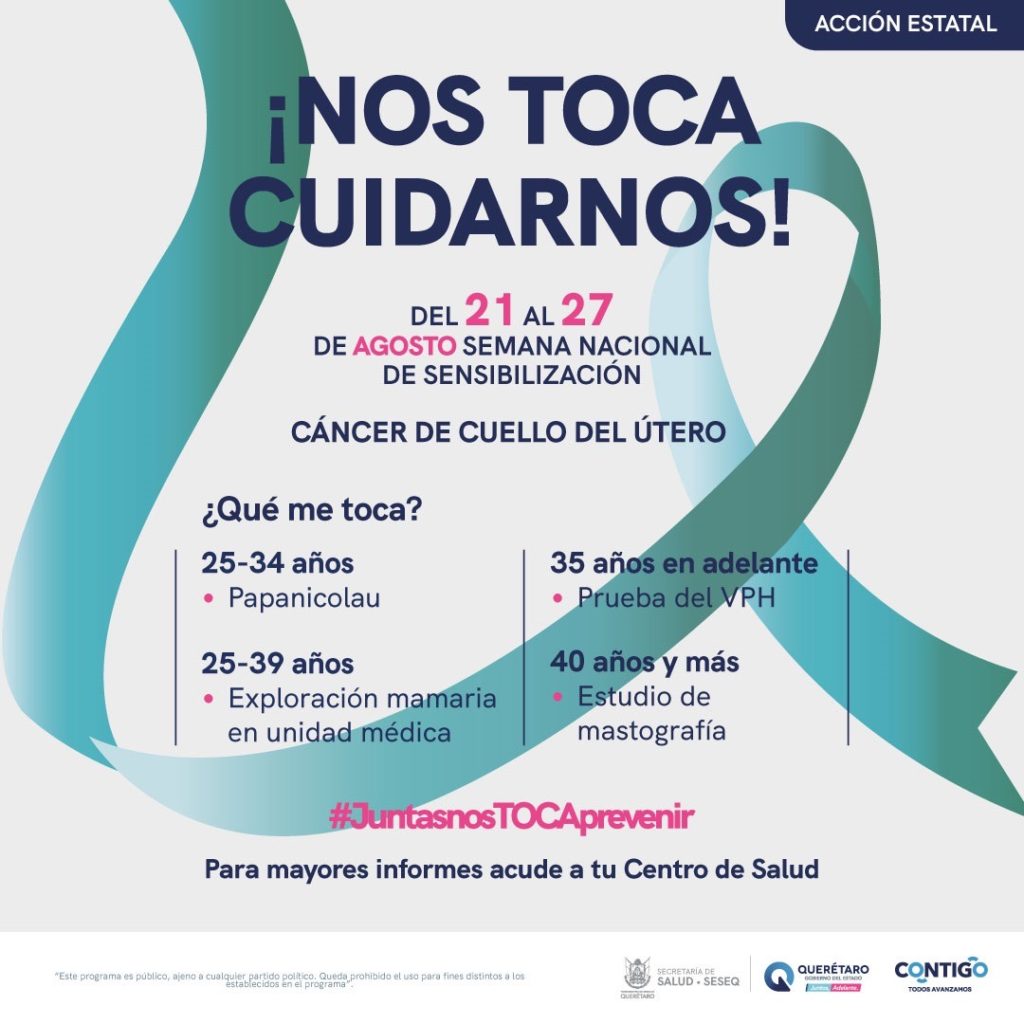 La Secretaría de Salud (SESA) del Estado anunció que del 21 al 27 de agosto llevará a cabo la Semana de Sensibilización de Cáncer de Cuello del Útero, con la finalidad de que las mujeres de 25 a 34 años acudan a los Centros de Salud a solicitar se realice un Papanicolaou (citología cervical), y de 35 y más para la prueba de Virus de Papiloma Humano (VPH)