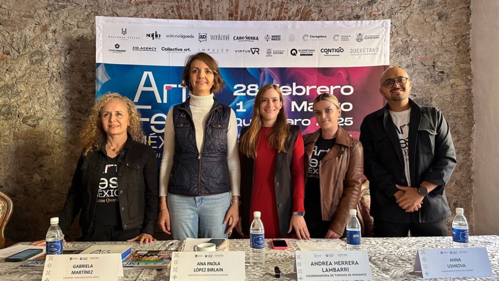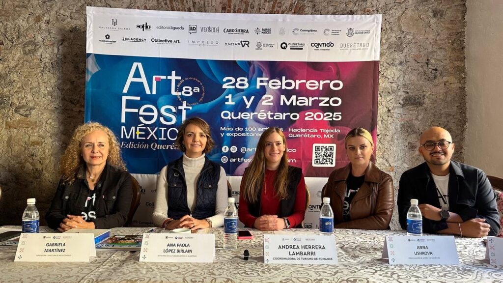 La secretaria de Cultura del estado, Ana Paola López Birlain, encabezó el anuncio de la octava edición del ArtFestQuerétaro, que se realizará del 28 de febrero al 2 de marzo en la Hacienda Tejeda del municipio de Corregidora, con la participación de más de 100 artistas plásticos, pintores y escultores, así como expositores y expositoras de arte de todo el país.