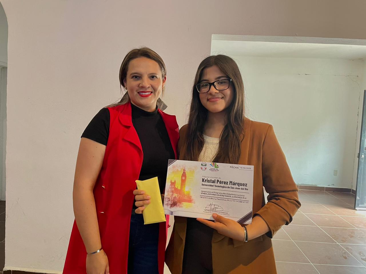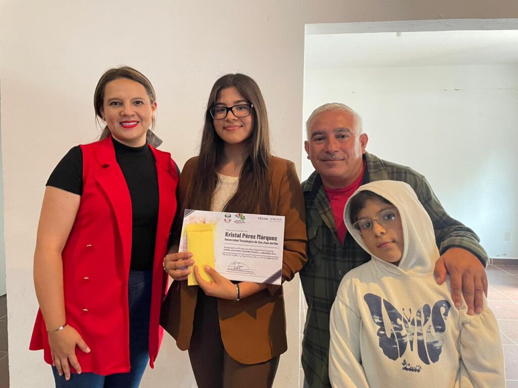 Esta tarde, la presidenta municipal Yuni Benítez, entregó un apoyo económico a la joven Kristal Pérez Márquez, alumna de la Universidad Tecnológica de San Juan del Río (UTSJR), quien fue seleccionada para participar en el programa de movilidad internacional “Embajadores Querétaro”.