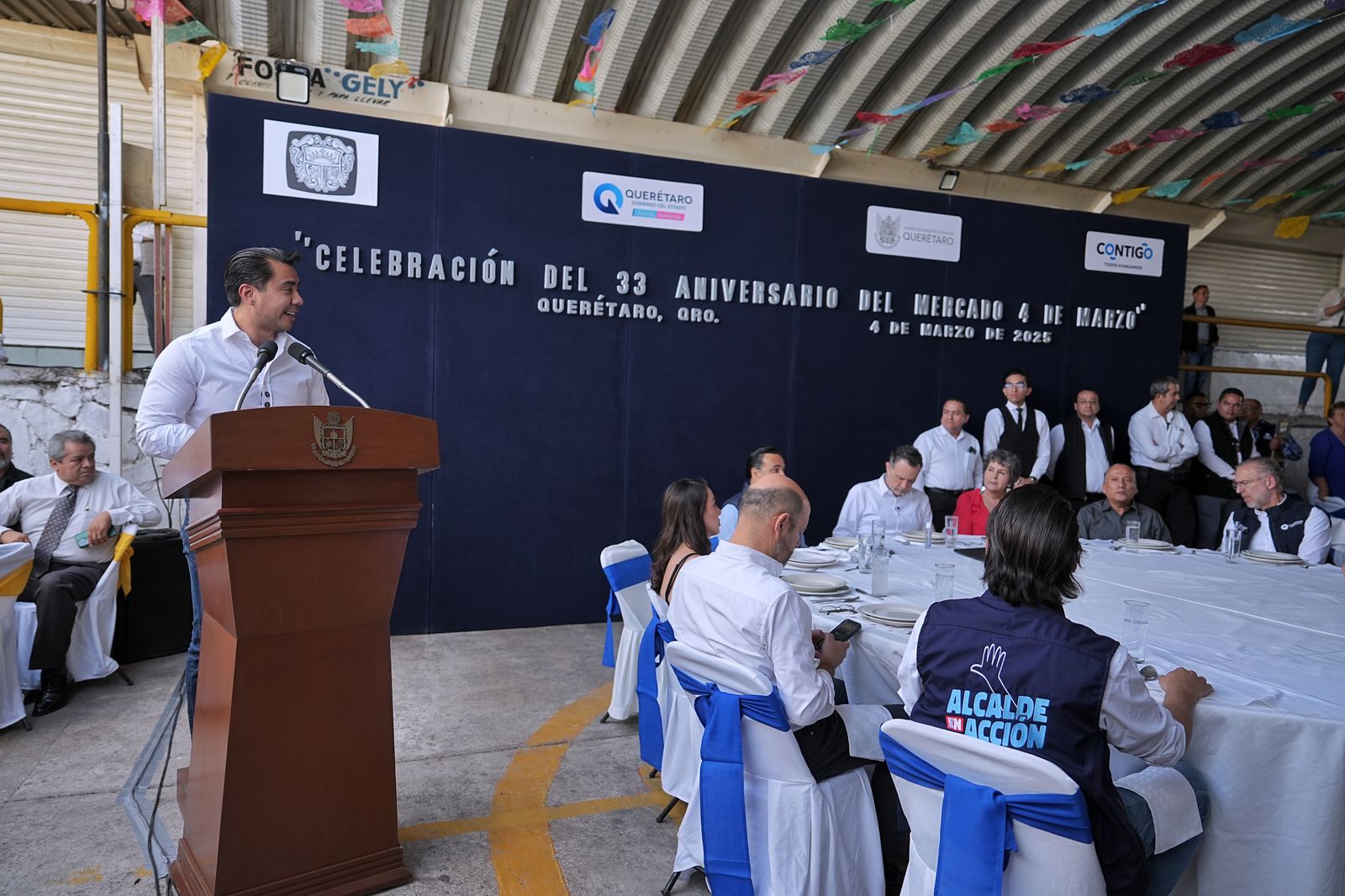 - El presidente municipal de Querétaro, Felifer Macías, asistió junto al Gobernador del Estado, Mauricio Kuri, a la celebración del 33 aniversario del Mercado 4 de Marzo, donde destacó la relevancia de este mercado para el sur de la ciudad y su contribución al fortalecimiento de la economía local y el sustento de las familias que dependen de él