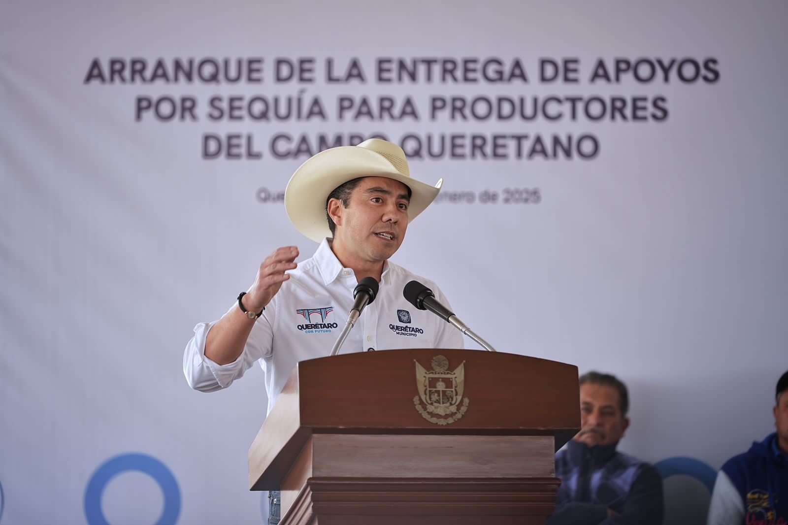- El presidente municipal de Querétaro, Felifer Macías, acompañó al gobernador del estado, Mauricio Kuri González, a la entrega de apoyos por sequía para productores del campo queretano, que se realizó en la explanada del Lienzo Charro en la Delegación Santa Rosa Jáuregui.