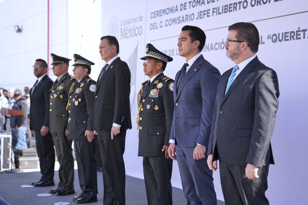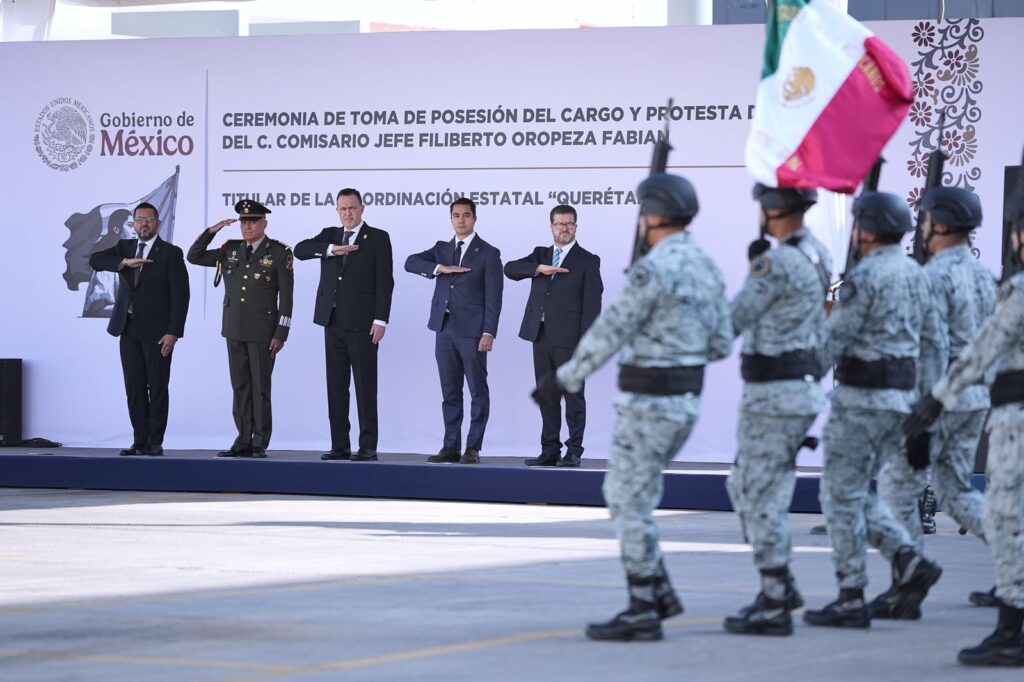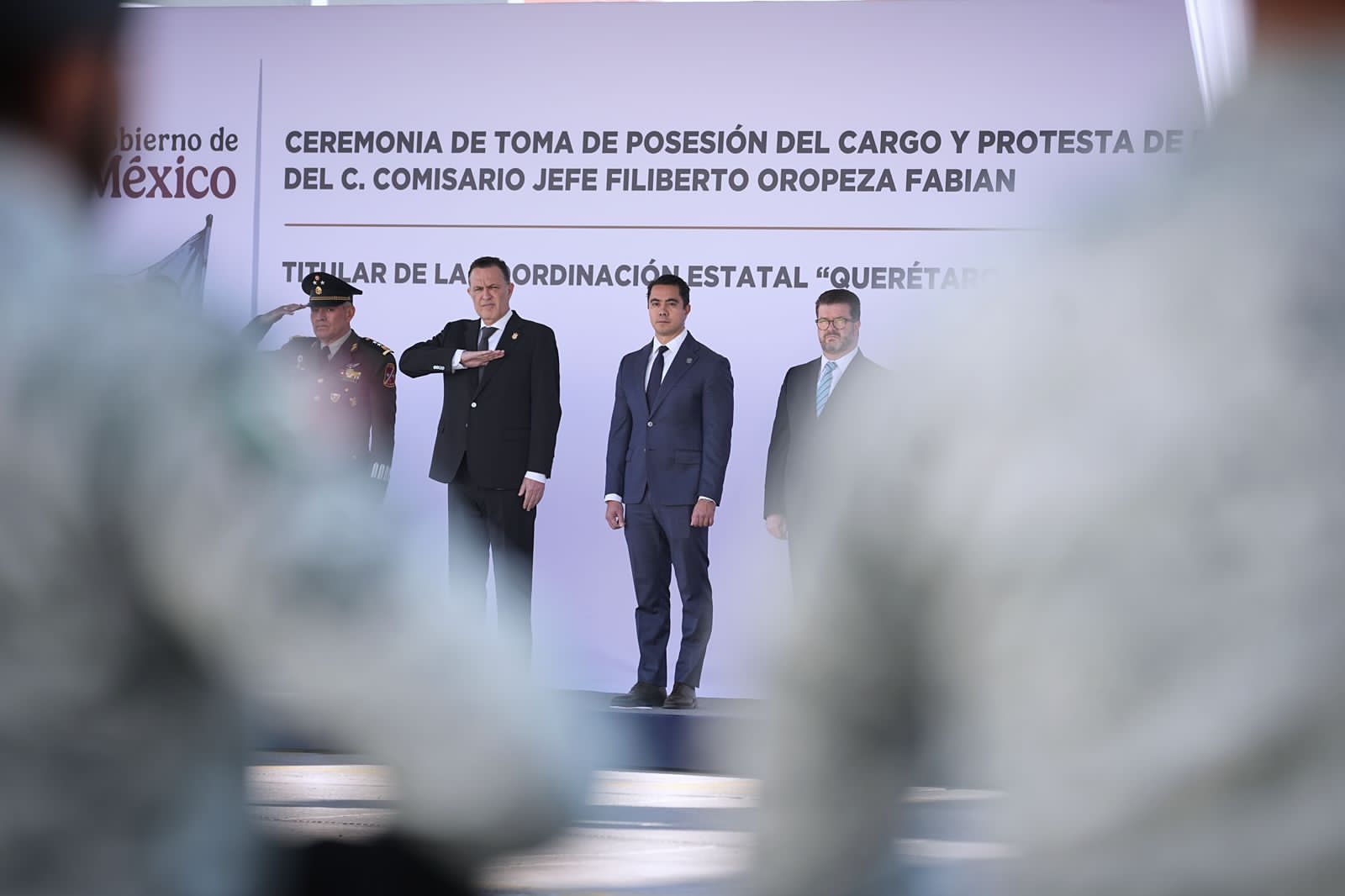El presidente municipal de Querétaro, Felifer Macías, acompañó al gobernador del estado Mauricio Kuri González, a la toma de posesión del cargo y protesta de Bandera del C. Comisario Jefe Filiberto Oropeza Fabián, como nuevo titular de la Coordinación Estatal de la Guardia Nacional en Querétaro.