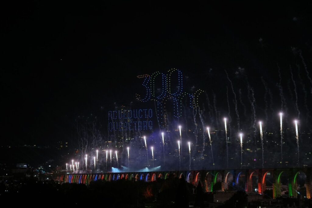 El alcalde realizó un recorrido a través de los cinco escenarios instalados por toda la Calzada de los Arcos como: Folklor y Tradiciones, Dj’s, Querétaro Tierra de Compositores y Cantantes, Del Rock al Danzón y finalmente, en el escenario principal, donde presenció junto con las y los queretanos el espectáculo de luces, sonido y drones, en el cual se lograron apreciar diferentes figuras en el momento cumbre de la velada.