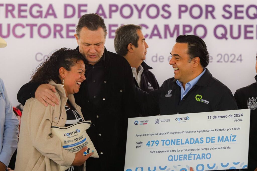 El Presidente Municipal de Querétaro, Luis Nava, acompañó al Gobernador del Estado, Mauricio Kuri González, a la entrega de Apoyos por Sequía a Productores del Campo Queretano, en la Unidad deportiva del Pueblito en el Municipio de Corregidora, en donde fueron entregadas 479 toneladas a productores de temporal de la Capital afectados por la sequía prolongada que se presentó durante los ciclos productivos 2022 y 2023.