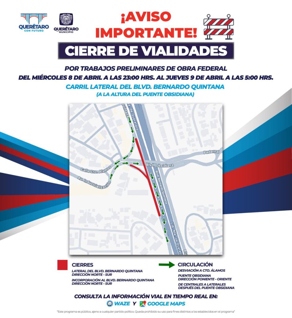 ¡ATENCIÓN! POR TRABAJOS PRELIMINARES DE OBRA, HABRÁ CIERRES EN CARRIL LATERAL DEL BLVD. BERNARDO QUINTANA