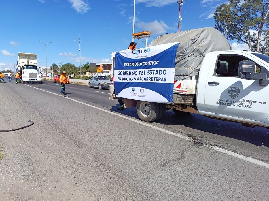 Con el propósito de impulsar la movilidad del estado y fortalecer la seguridad vial, el sector de Obras Públicas del Estado, a través de la Comisión Estatal de Infraestructura (CEI), ejecuta el bacheo emergente de la Carretera Federal 120 San Juan del Río – Xilitla, en el tramo de San Juan del Río a Tequisquiapan, en los mismos municipios.
