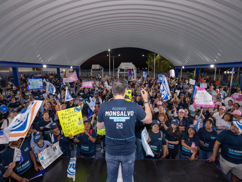 El candidato a la presidencia municipal de El Marqués por el Partido Acción Nacional (PAN), Rodrigo Monsalvo Castelán, acudió a un mitin que se llevó a cabo en el arcotecho del fraccionamiento Paseos del Marqués.
