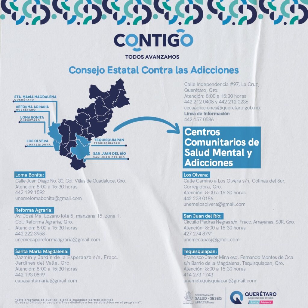 La Secretaría de Salud (SESA) estado de Querétaro informa que a través del Consejo Estatal contra las Adicciones (CECA) se brindan servicios para la prevención y la promoción de la salud mental, así como tratamiento breve, ambulatorio, que consiste en atención psicológica y consejería con el objetivo de prevenir enfermedades como el alcoholismo, el tabaquismo, la farmacodependencia, ludopatía, u otras adicciones.