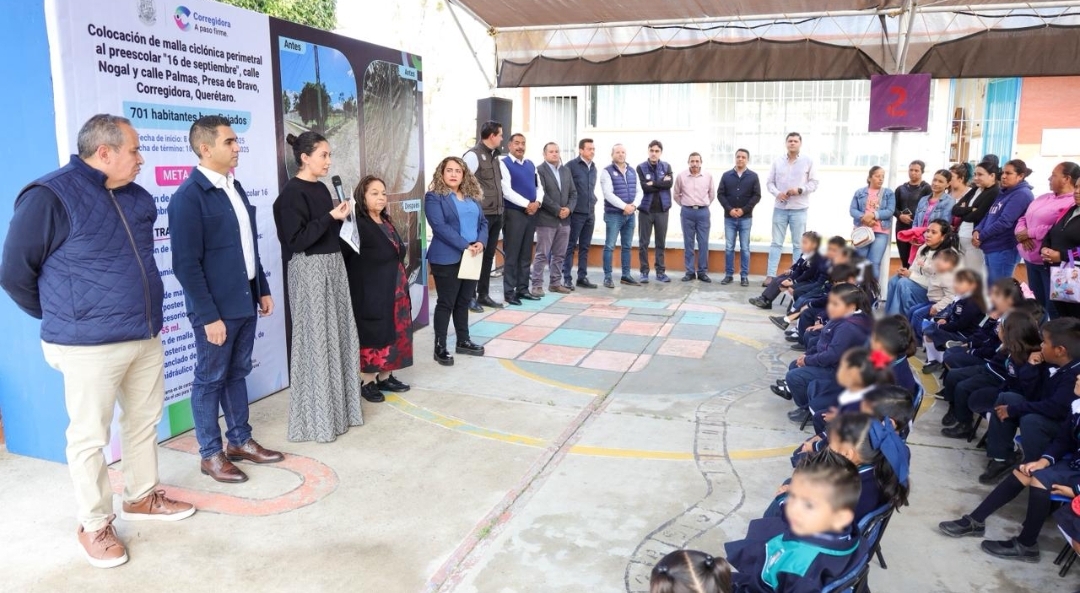 CORREGIDORA RENUEVA LA MALLA CICLÓNICA DEL JARDÍN DE NIÑOS “16 DE SEPTIEMBRE”, EN PRESA DE BRAVO