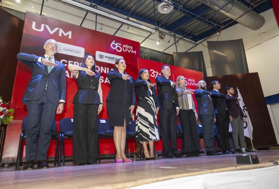En el marco de los festejos por el 65 aniversario de la Universidad del Valle de México, el gobernador, Mauricio Kuri González, en compañía de la presidenta del Sistema Estatal DIF, Car Herrera, encabezó la ceremonia conmemorativa alusiva a los 37 años de legado de la UVM, campus Querétaro; institución que, dijo, contribuye de manera fundamental al liderazgo que tiene la entidad resultado de su sistema educativo robusto, su enfoque multicultural, y sus programas innovadores e inclusivos.