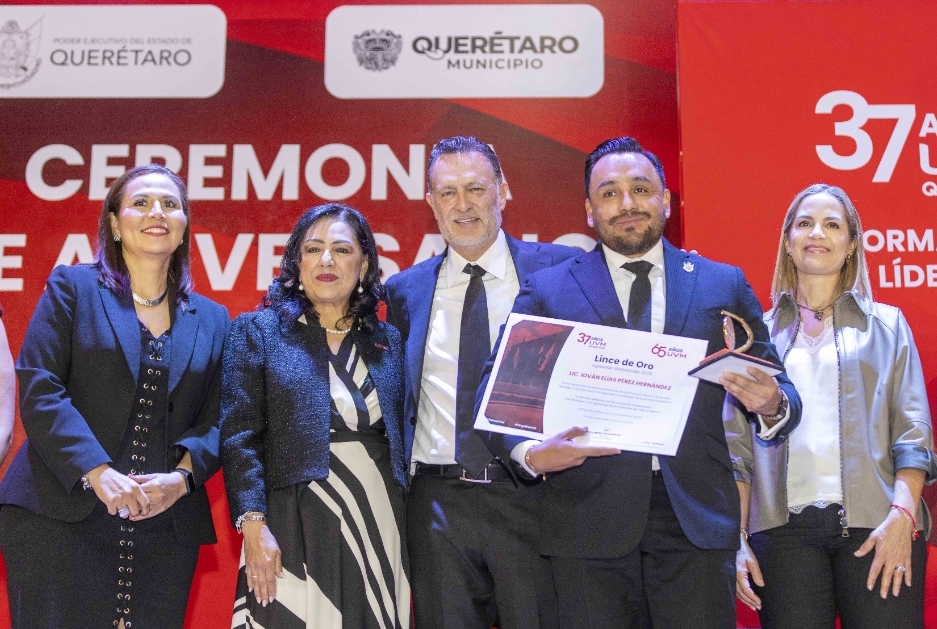 En la ceremonia, donde también entregaron a estudiantes y profesores la presea “Linces de Oro”, en reconocimiento a su destacada labor en diversas disciplinas en favor de la comunidad universitaria; el secretario de Seguridad Ciudadana, Iován Elías Pérez Hernández, fue distinguido con la insignia en la categoría Egresado Destacado; espacio en el que la rectora de la UVM Campus Querétaro, Miriam Pérez Gutiérrez, ponderó la apertura hace 37 años de este complejo educativo en una entidad que, subrayó, les abrió las puertas, el corazón y les enseñó que Querétaro es tierra y sinónimo de futuro.