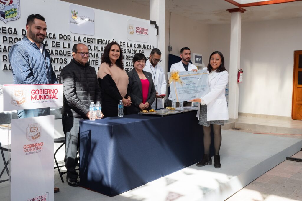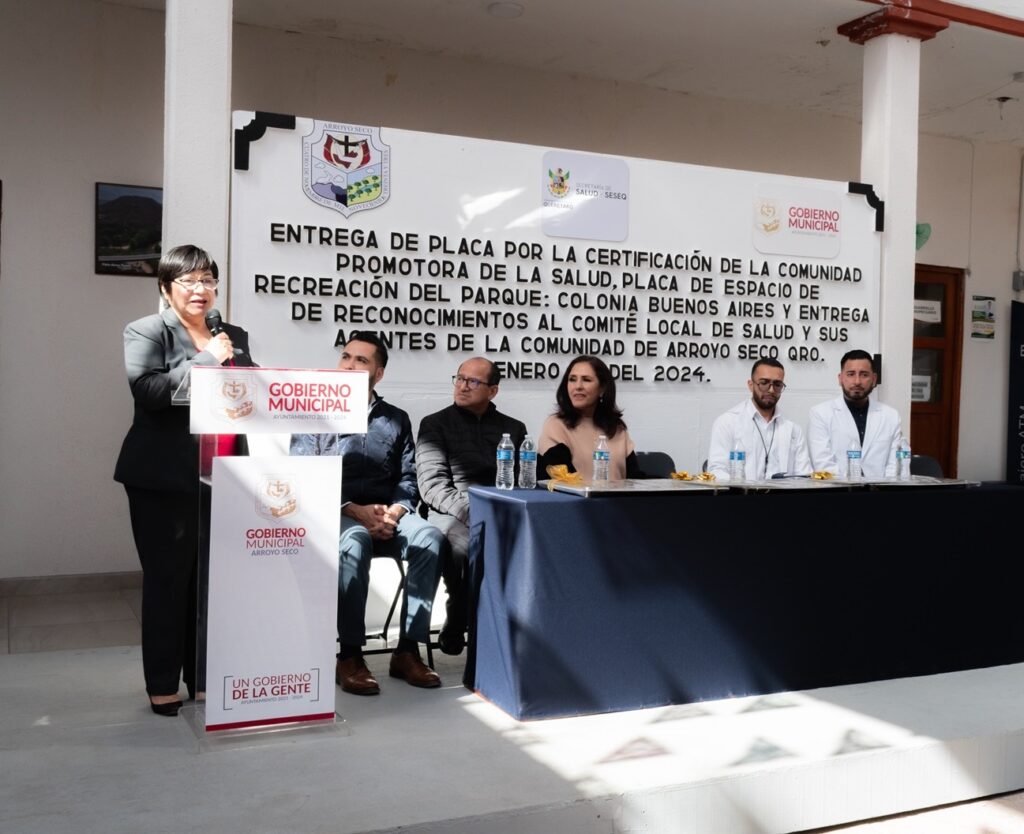 La titular de la Secretaría de Salud (SESA) del estado, Martina Pérez Rendón, encabezó la ceremonia de entrega de las placas que acreditan la certificación de la localidad de Arroyo Seco, como Comunidad Saludable, y como Escuelas Promotoras de Salud a la Primaria Rafael Huerta y a la Secundaria Justo Sierra, además de la certificación de la Unidad Deportiva “Arroyo Seco” y del Parque Recreativo “Colonia Buenos Aires”, como Entornos Saludables.