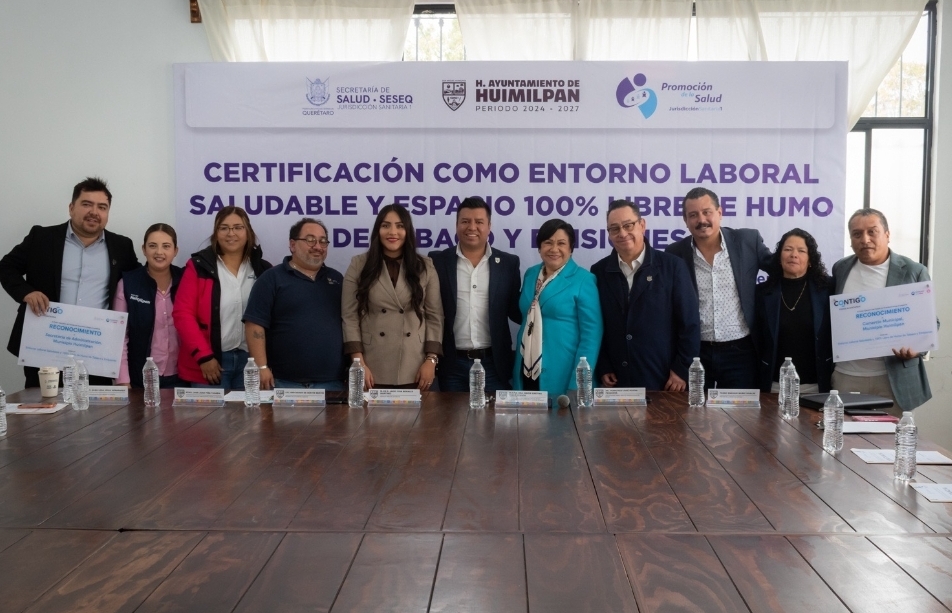 La titular de la Secretaría de Salud (SESA) del estado de Querétaro, Martina Pérez Rendón, presidió la ceremonia de entrega de placas que acreditan la certificación de dos edificios del municipio de Huimilpan como Entornos Laborales Saludables y 100 por ciento Libres de Humo de Tabaco, reconocimientos que dan cuenta del compromiso institucional orientado a la protección, promoción y fortalecimiento de la salud de las y los trabajadores.
