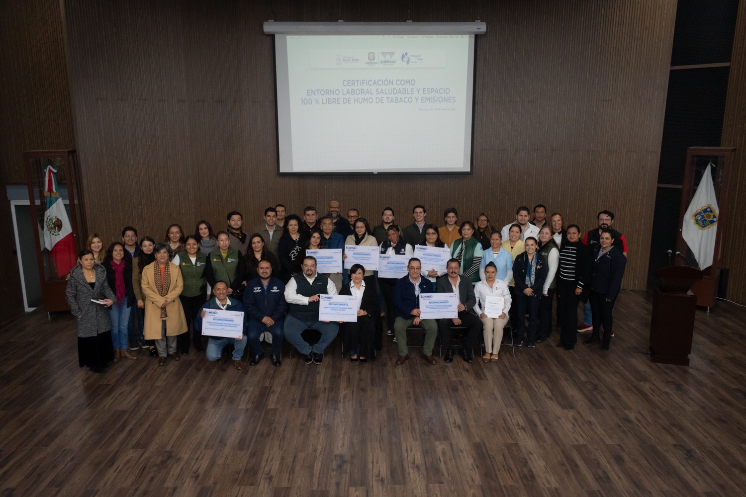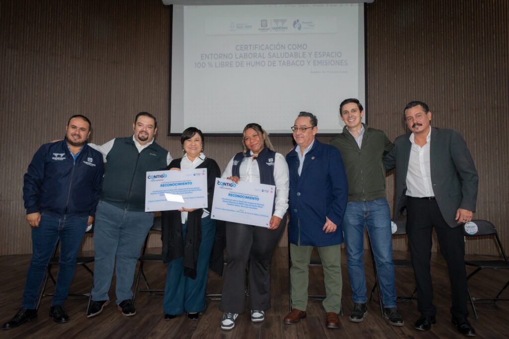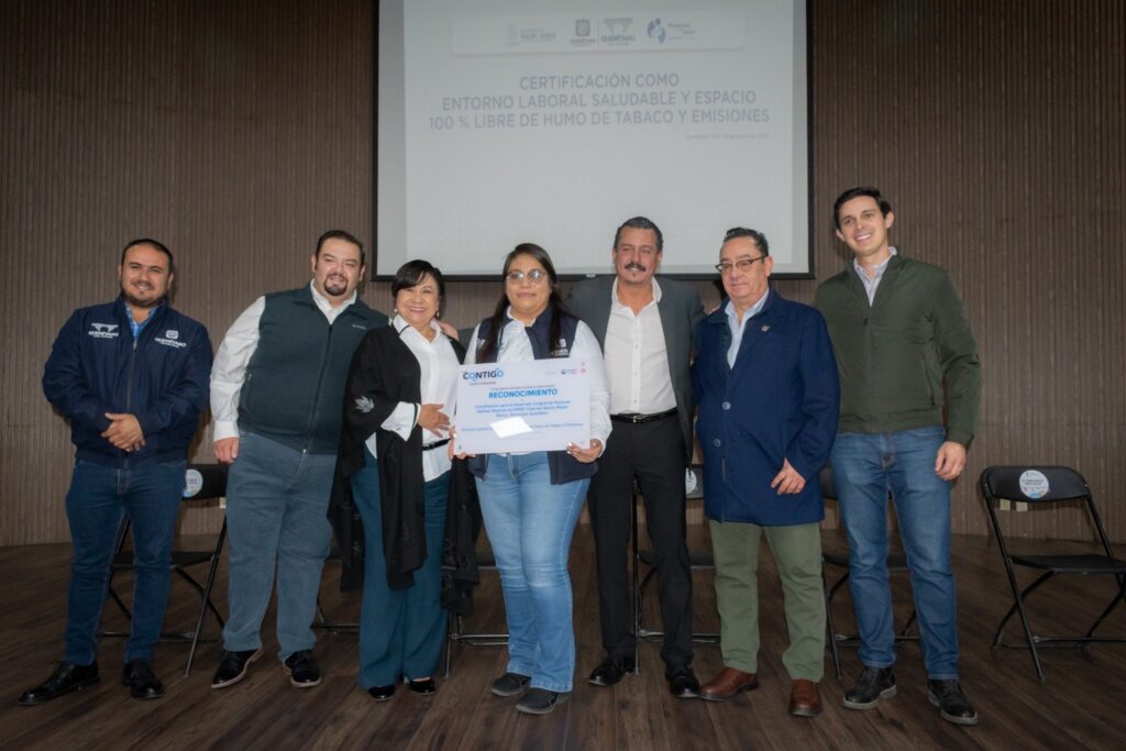 La titular de la Secretaría de Salud (SESA) del estado de Querétaro, Martina Pérez Rendón, encabezó la ceremonia de entrega de placas que acreditan la certificación de diez edificios del municipio de Querétaro como Entornos Laborales Saludables y 100 por ciento Libres de Humo de Tabaco, reconocimientos que refrendan el compromiso institucional con la protección, promoción y fortalecimiento de la salud de las y los trabajadores.