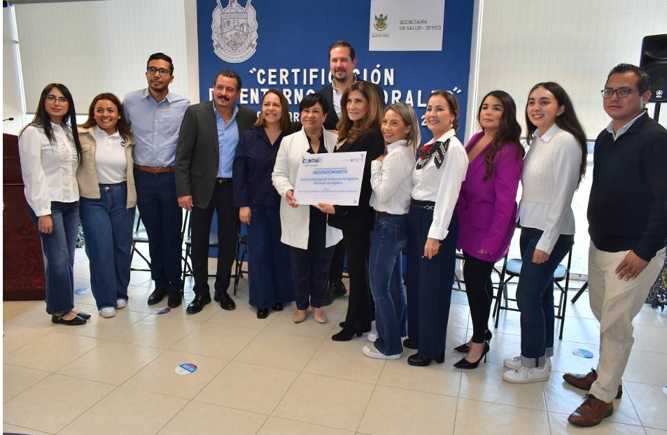 La titular de la Secretaría de Salud (SESA) del estado de Querétaro, Martina Pérez Rendón, encabezó la ceremonia de entrega de placas que acreditan la certificación de dos edificios del municipio de Corregidora como Entornos Laborales Saludables y 100 por ciento Libres de Humo de Tabaco. Estos reconocimientos reflejan el compromiso institucional de impulsar acciones orientadas a la protección, promoción y fortalecimiento de la salud y el bienestar de las y los trabajadores.