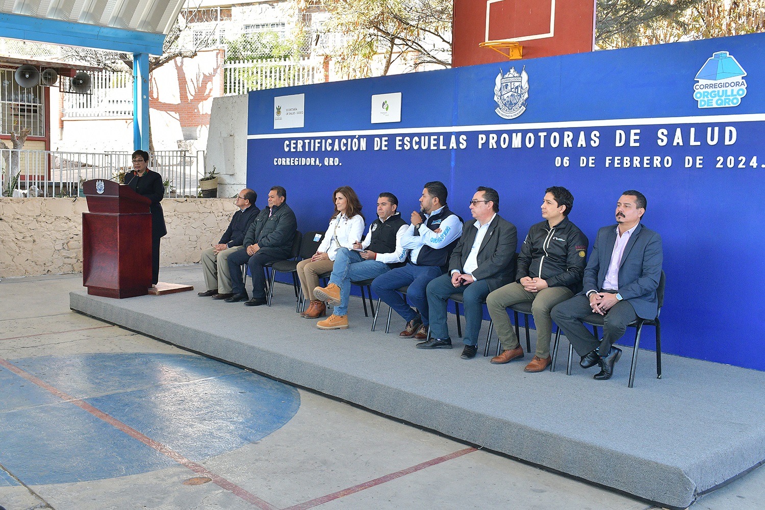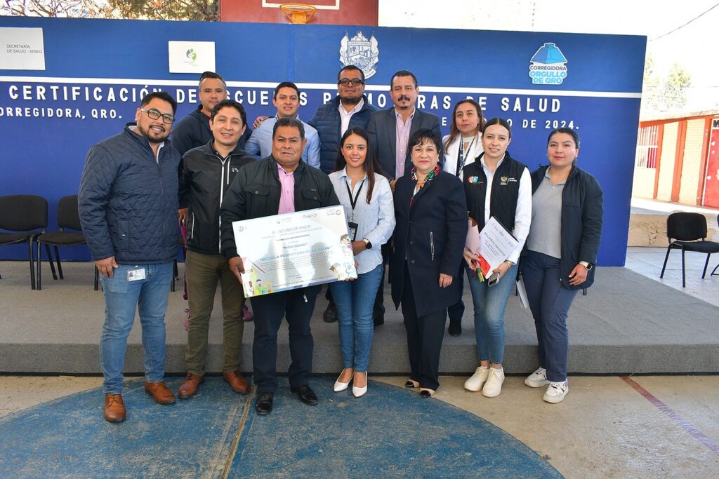 La titular de la Secretaría de Salud (SESA) del estado, Martina Pérez Rendón, presidió la ceremonia de entrega de las placas que acreditan la certificación de las Escuelas Promotoras de Salud a las Primarias Benito Juárez, Lic. José María Truchuelo y Niños Héroes, ubicadas en el municipio de Corregidora.