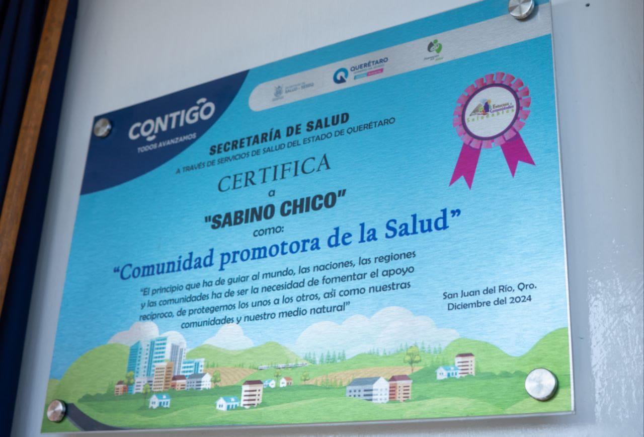 Derivado de la implementación de acciones para fomentar la salud, los hábitos y entornos de vida saludable, la Secretaría de Salud del Estado de Querétaro certificó a la localidad de Sabino Chico, ubicada en el municipio de San Juan del Río, como Comunidad Promotora de la Salud, por lo que la población deberá mantener y promover dichas acciones.