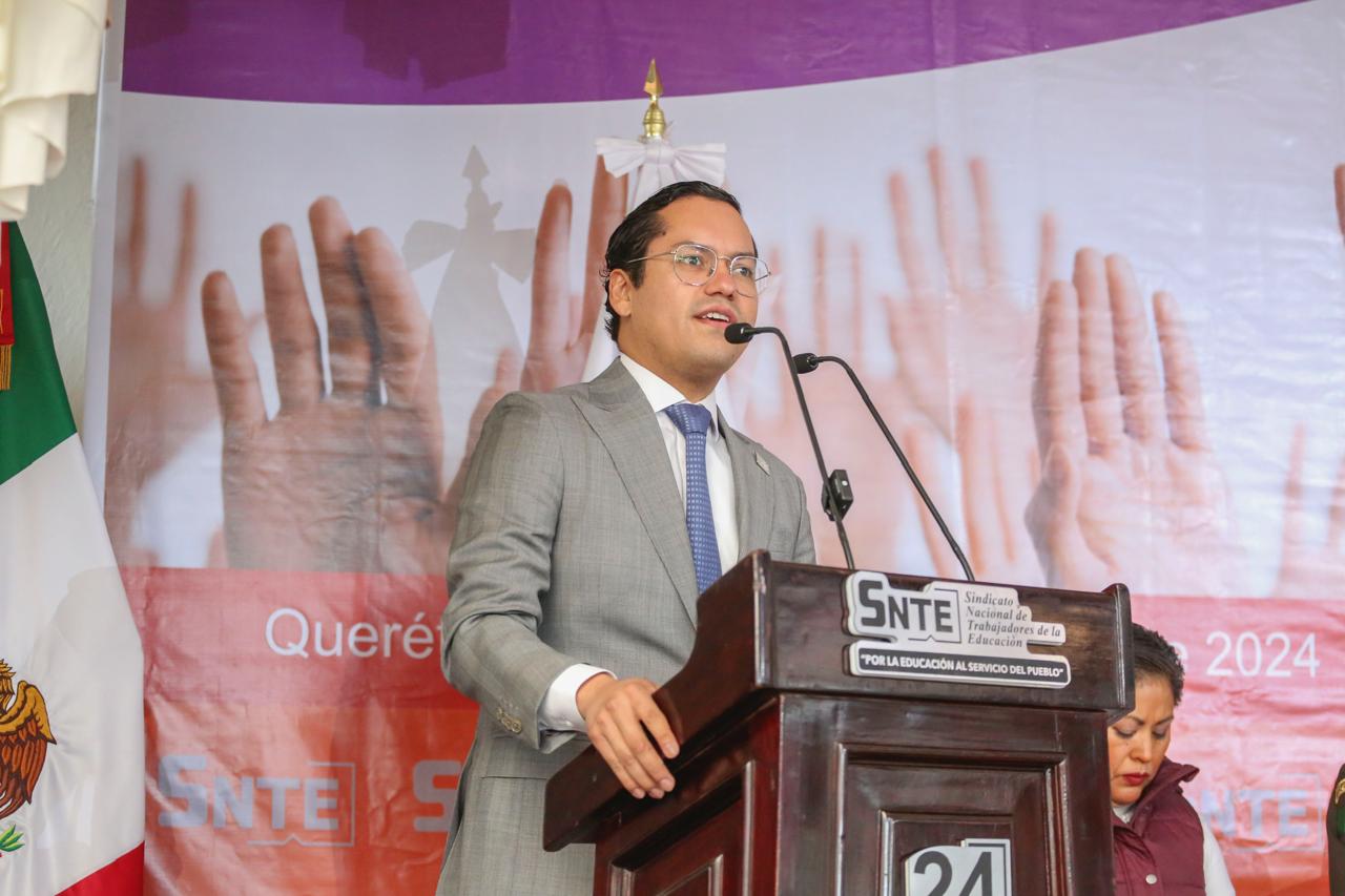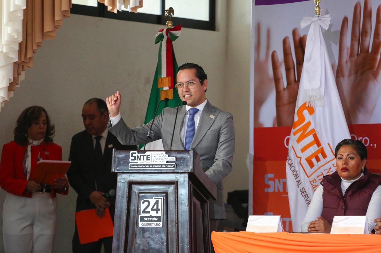 El presidente municipal de Corregidora, Chepe Guerrero, acudió al VIII Pleno Seccional Extraordinario de la Sección 24 del Sindicato Nacional de Trabajadores de la Educación (SNTE), donde reconoció la importancia de las maestras y los maestros para todos los mexicanos. Los calificó como aliados por el impulso que, desde las aulas, dan a las políticas públicas y también destacó su lucha en defensa de la educación.