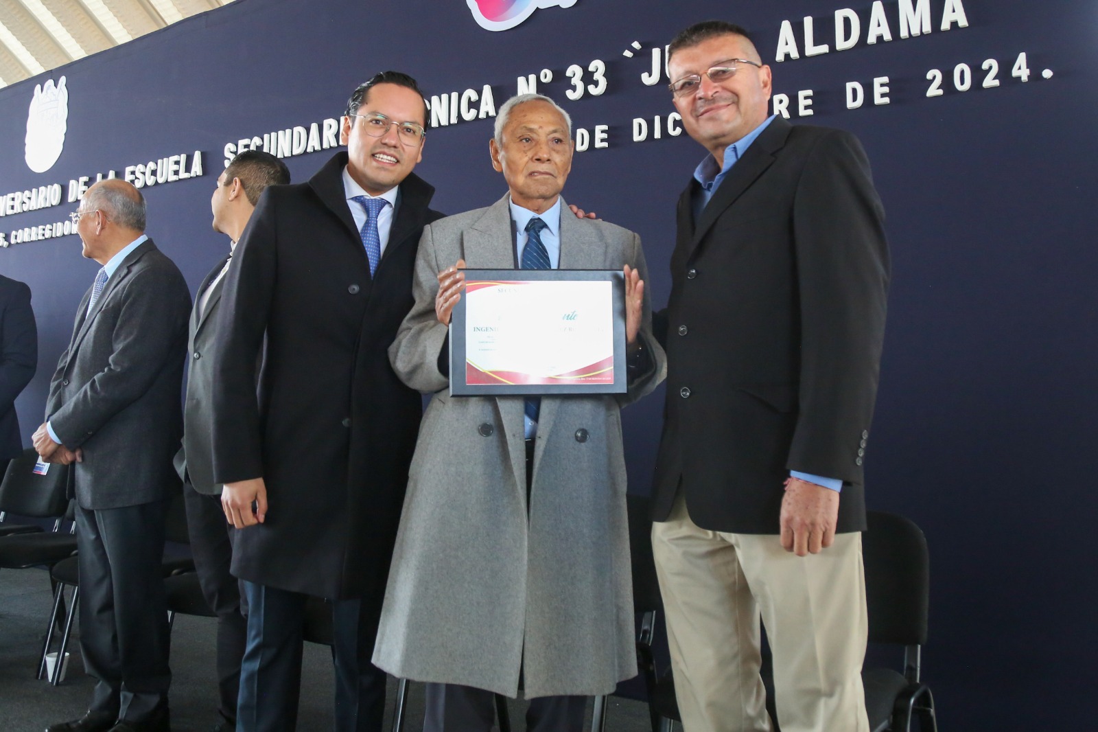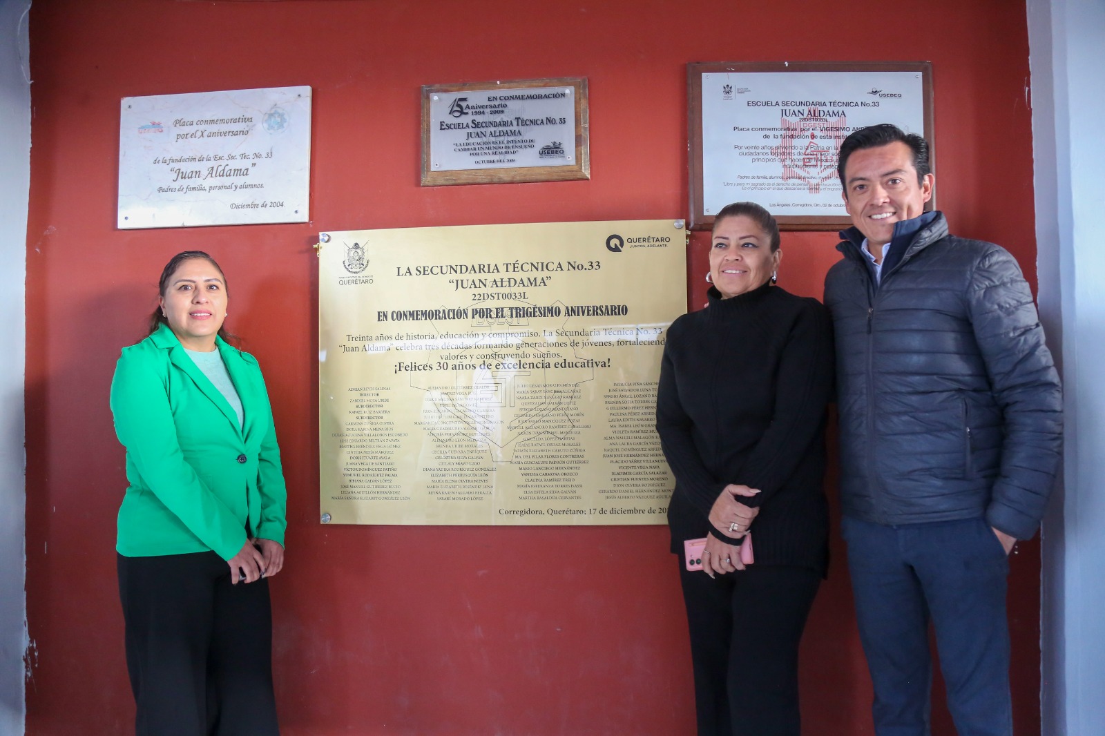 El presidente municipal de Corregidora, Chepe Guerrero, anunció la construcción de una aula-cocina para el próximo año en beneficio de las y los alumnos de la Escuela Secundaria Técnica No. 33 «Juan Aldama» en la Colonia Los Ángeles, donde develó una placa conmemorativa, por el 30 aniversario.