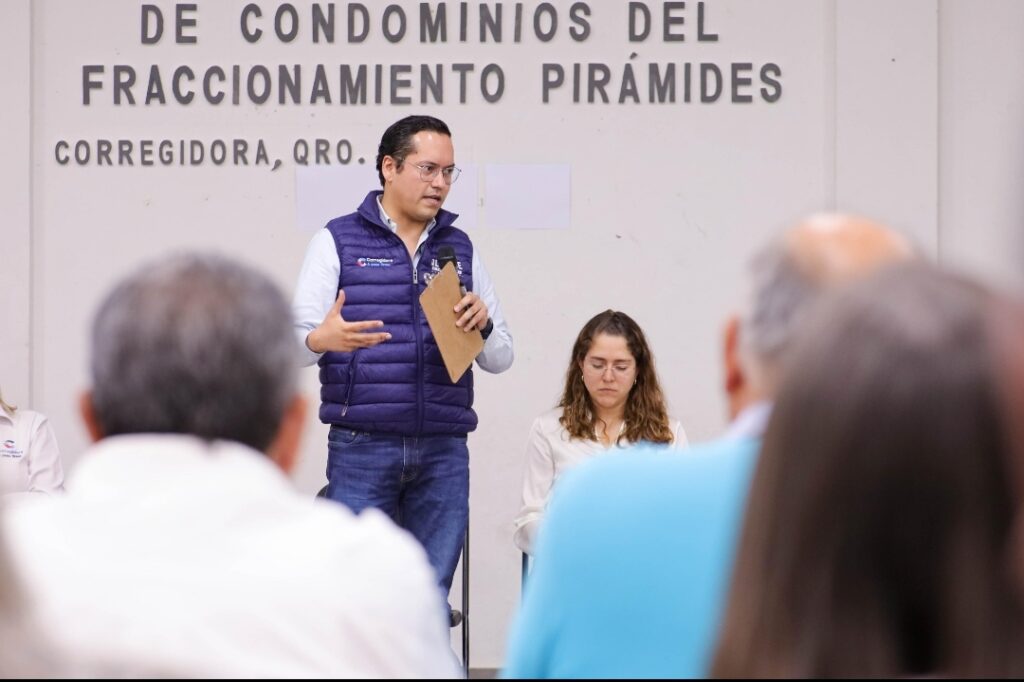 El presidente municipal de Corregidora, Chepe Guerrero, sostuvo una reunión de trabajo con las y los administradores de los 31 condominios del fraccionamiento Pirámides y zonas aledañas, acompañado por integrantes de su gabinete, con el objetivo de escuchar y dar seguimiento a las principales inquietudes de las y los vecinos en materia de desarrollo urbano, servicios públicos, seguridad, movilidad y obra pública.