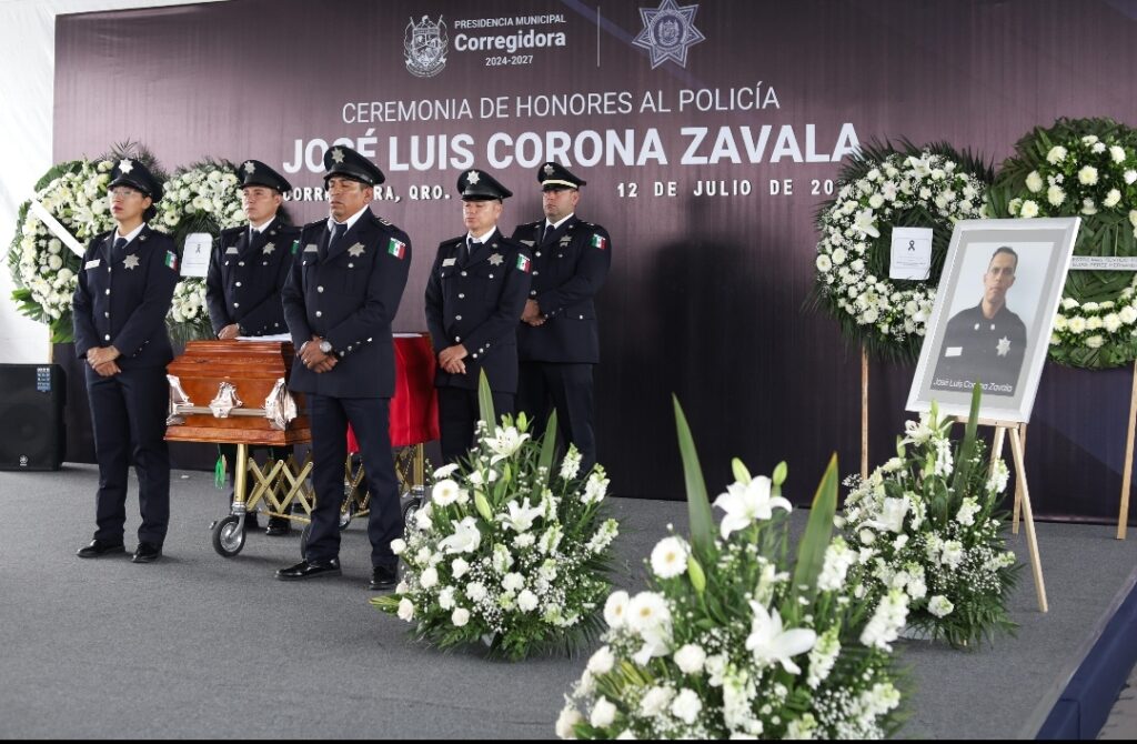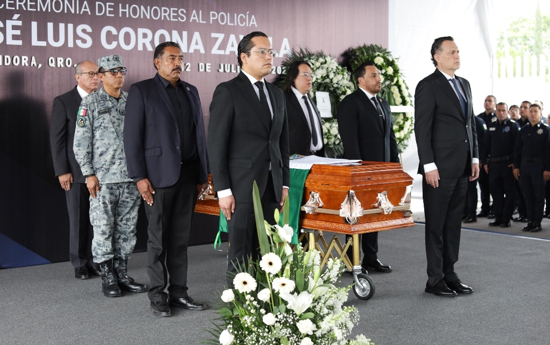 El presidente municipal de Corregidora, Chepe Guerrero y el gobernador del estado, Mauricio Kuri, encabezaron la Ceremonia de Honores al policía José Luis Corona Zavala, quien falleció en el cumplimiento de su deber la mañana del viernes 11 de julio, mientras realizaba labores ministeriales en apoyo a la Fiscalía General del Estado.