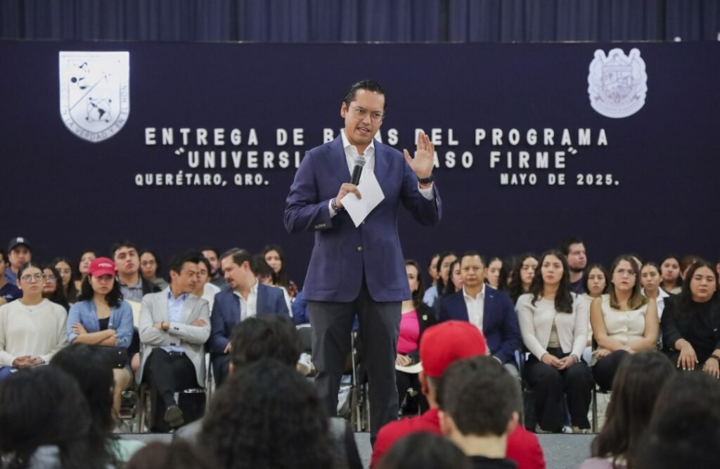 En la Universidad Autónoma de Querétaro, el presidente municipal de Corregidora, Chepe Guerrero, acompañado de la rectora Silvia Lorena Amaya Llano, entregó becas del programa “Universitario a Paso Firme” a 926 alumnas y alumnos, con el propósito de apoyar su formación académica y aliviar la carga económica de sus familias.