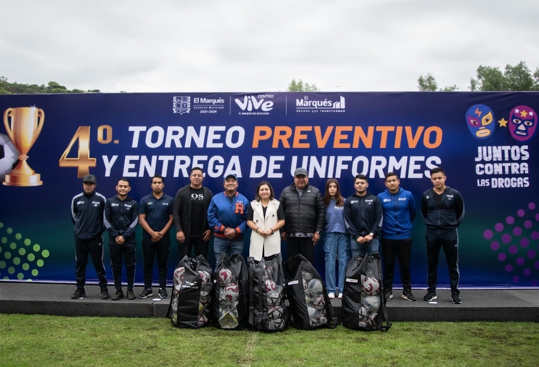 La presidenta municipal de El Marqués, Claudia Martínez Guevara, encabezó el 4° Torneo Preventivo y la Entrega de Uniformes y Material Deportivo a Academias, en la Unidad Deportiva de La Cañada.